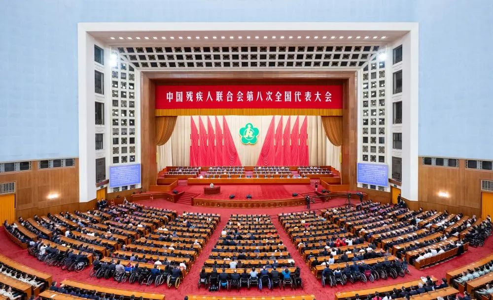 人民大会堂大礼堂灯光璀璨,气氛隆重热烈。主席台上方悬挂着“中国残疾人联合会第八次全国代表大会”的会标,后幕正中的中国残联会徽格外醒目,10面红旗分列两侧。二楼眺台上悬挂着“以习近平新时代中国特色社会主义思想为指导,全面贯彻党的二十大精神,团结带领广大残疾人在中国式现代化进程中创造更加幸福美好的生活!”巨型横幅。来自全国各地的600多名代表,肩负着约8500万残疾人的重托出席大会。
