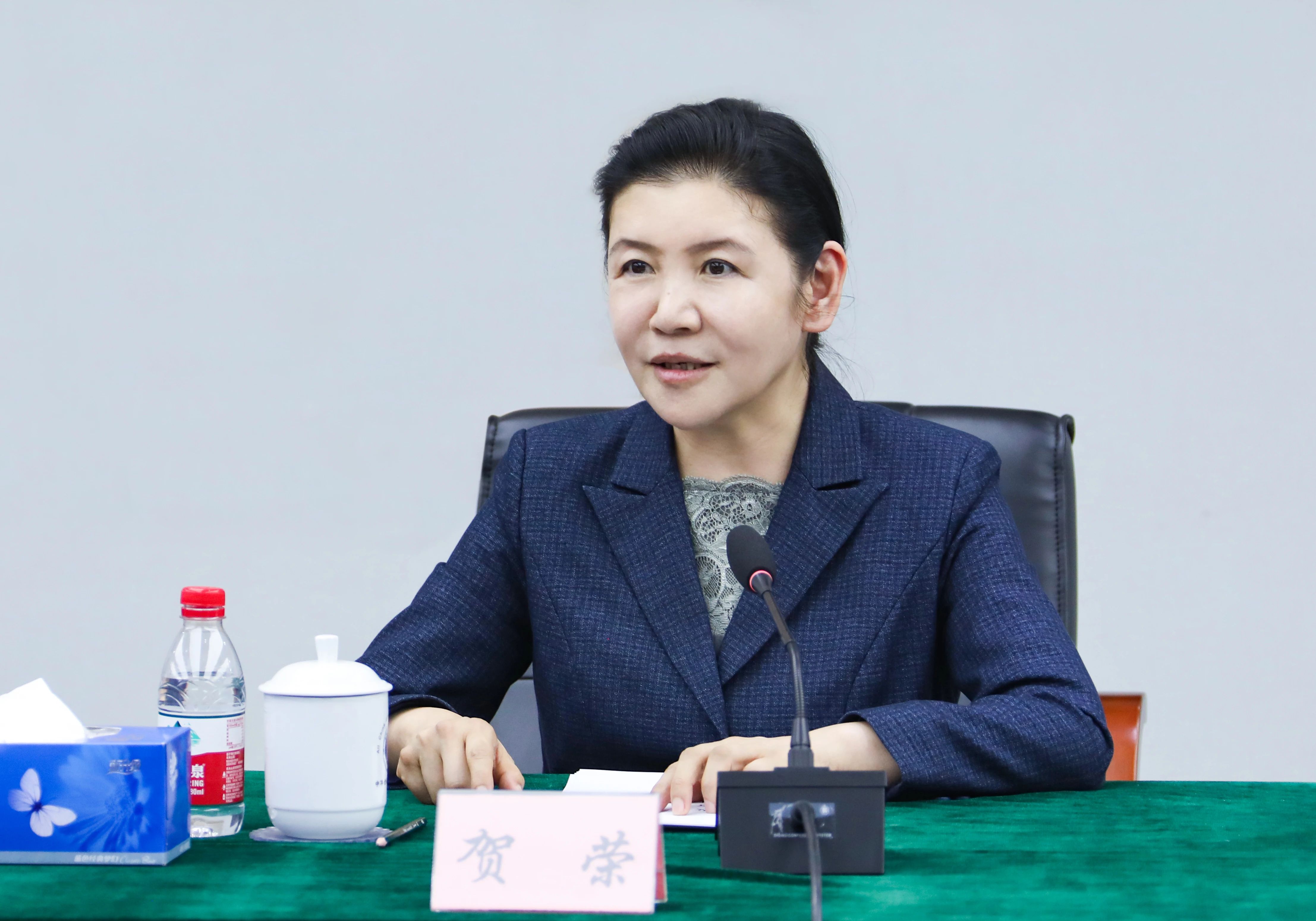 司法部党组书记、部长贺荣在座谈会上讲话。