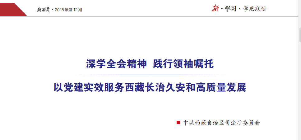 在西藏自治区成立60周年之际,习近平总书记率中央代表团进藏出席庆祝活动,为西藏自治区题词“共建中华民族共同体、书写美丽西藏新篇章”,听取自治区党委、政府工作汇报并发表重要讲话,对西藏各项工作提出新的更高要求,指引激励着西藏各族干部群众奋力谱写长治久安和高质量发展新篇章。西藏司法行政系统始终牢记嘱托、感恩奋进,全面贯彻党的二十届三中、四中全会和习近平总书记在西藏视察时的重要讲话精神,深入学习贯彻习近平法治思想和习近平总书记关于党的建设的重要思想、关于党的自我革命的重要思想,坚定坚决贯彻落实习近平总书记关于西藏工作的重要指示和新时代党的治藏方略,以高质量机关党建促进高质量发展为主题,以落实机关党建主体责任为牵引,以严格执行党内法规制度为抓手,以党建和业务深度融合为重点,进一步改进作风狠抓落实,坚持“四个带头”,当好“三个表率”,建设模范机关,为服务全区长治久安和高质量发展、奋力谱写中国式现代化西藏篇章贡献新的更大力量。