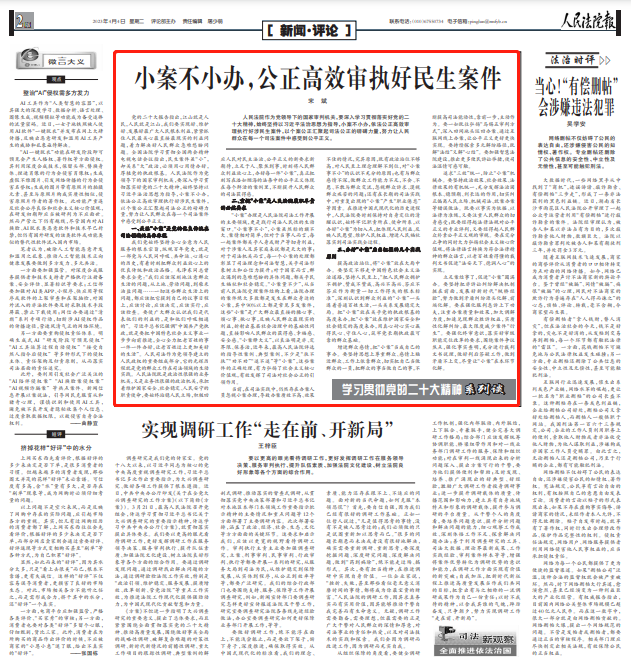 党的二十大擘画了以中国式现代化推进中华民族伟大复兴的宏伟蓝图,发出了为全面建设社会主义现代化国家、全面推进中华民族伟大复兴而团结奋斗的伟大号召。蓝图已经绘就,号角已经吹响。全国各级法院要把思想和行动统一到习近平总书记重要讲话精神上来,统一到党的二十大作出的重大决策部署上来,形成同心共圆中国梦的强大合力。2022年10月25日,人民法院报推出“学习贯彻党的二十大精神系列谈”专栏,邀请部分专家、学者及法院干警畅谈学习党的二十大精神的心得体会,敬请关注。