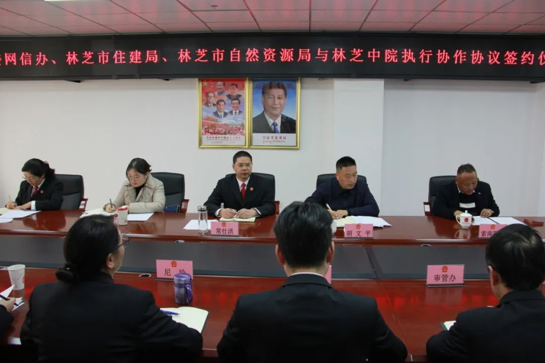 林芝市中级人民法院分别与三家单位签署《林芝市中级人民法院、中共林芝市委员会网络安全和信息化办公室关于建立执行联动协助机制的协议》《林芝市中级人民法院、林芝市住房和城乡建设局执行工作协作机制》《林芝市中级人民法院、林芝市自然资源局执行工作协作机制》。三份执行协作协议签订后,林芝中院将与市自然资源局实现“点对点”在法院线上完成对不动产的查询、查封等操作,与市住建局进一步规范对住房公积金的强制执行,与市委网信办进一步加大对失信被执行人的曝光力度和执行工作的宣传力度。本次执行协作协议的签订,既是认真贯彻落实2023年度全市执行联动联席会议精神的有力举措,也是进一步健全和完善执行联动机制实施细则,提升执行联动工作水平的有效抓手。