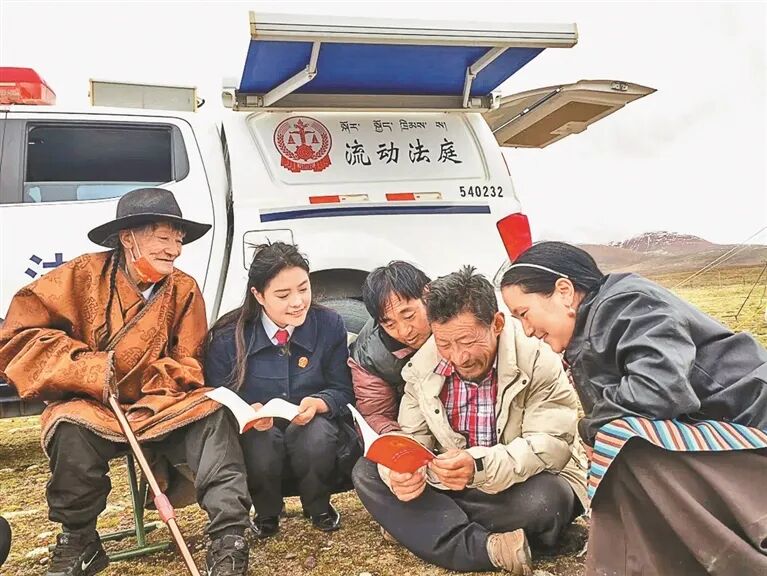 嘉黎县人民法院充分利用流动法庭,将文书送到牧民家门口。安多县人民法院雁石坪法庭干警和流动法庭来到牧区草场,进行巡回普法。