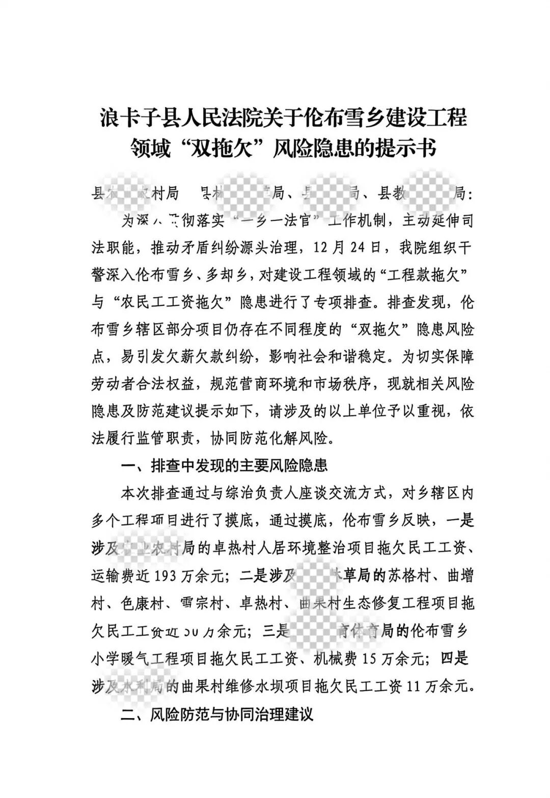 此项举措是浪卡子县人民法院将司法职能与社会基层治理体系深度融合的重要体现,通过发出具有司法权威性的风险告知书,不仅仅是向市场主体清晰传递了“治欠”高压信号,更与乡镇党委、政府、项目主管单位等建立了风险信息直通车,形成了“司法预警-行业监管”协同共治的闭环,强化了治理合力。
