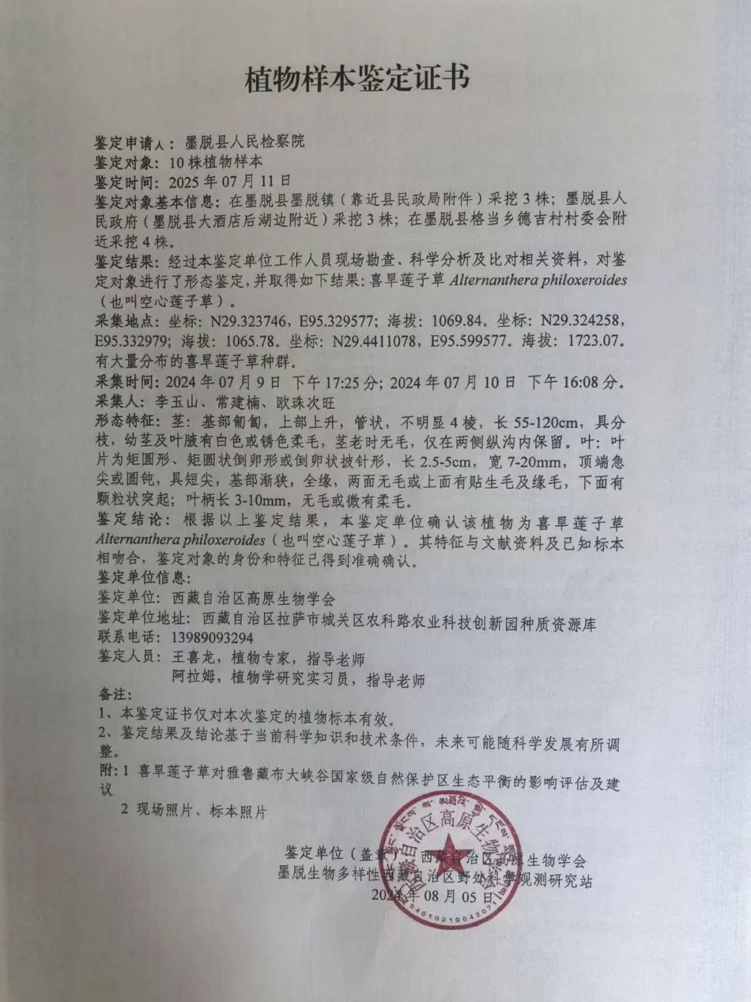 近期,墨脱县人民检察院在公益诉讼线索摸排工作中,发现疑似外来物种入侵植物踪迹。经西藏自治区高原学会科研团队专业鉴定,确认该物种为喜旱莲子草,当地俗称“空心莲”“空心苋”,在《中国外来入侵物种数据库(2023版)》中被列为I级恶性入侵物种。这是墨脱县首次发现该物种,其疯狂蔓延将直接导致区域生物多样性锐减,墨脱凤仙花、桫椤等珍稀物种面临生存危机。