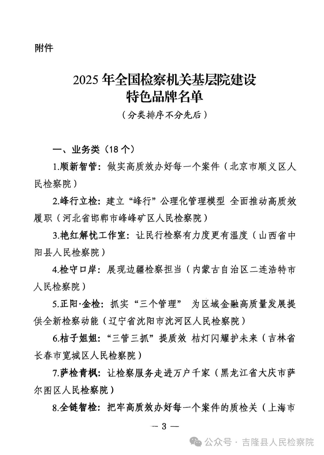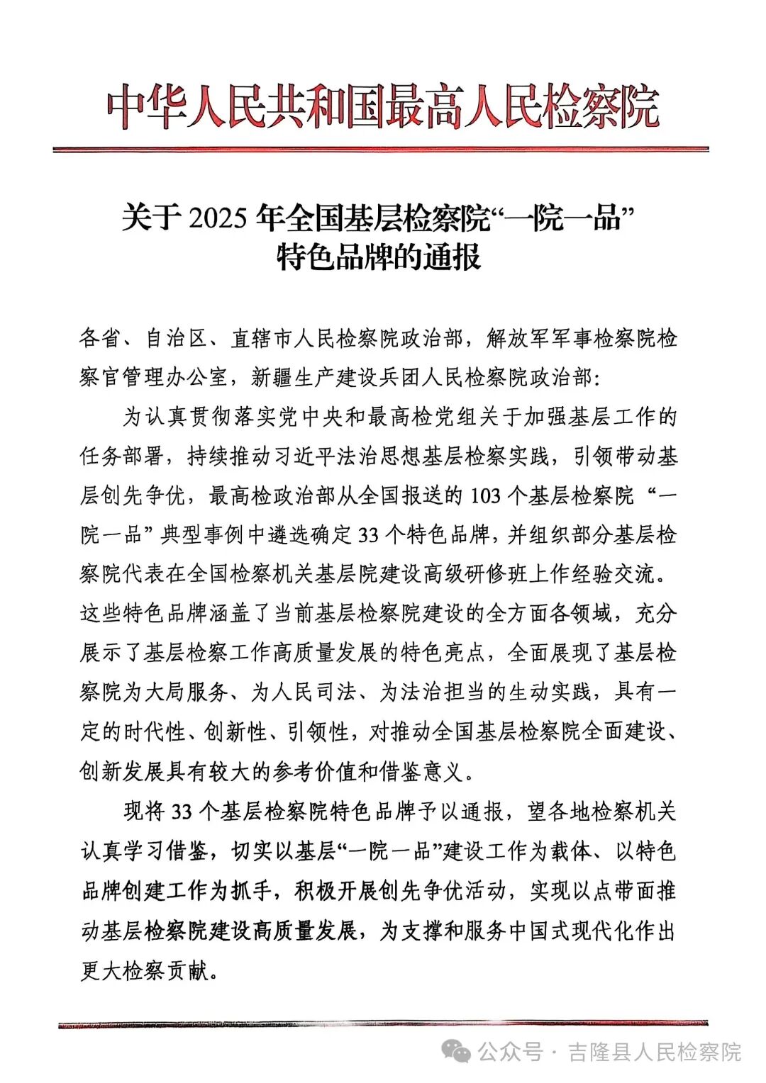 为认真贯彻落实党中央和最高检党组关于加强基层工作的任务部署,持续推动习近平法治思想基层检察实践,引领带动基层创先争优,近日,最高检政治部从全国报送的103 个基层检察院“一院一品”典型事例中遴选确定 33个特色品牌。