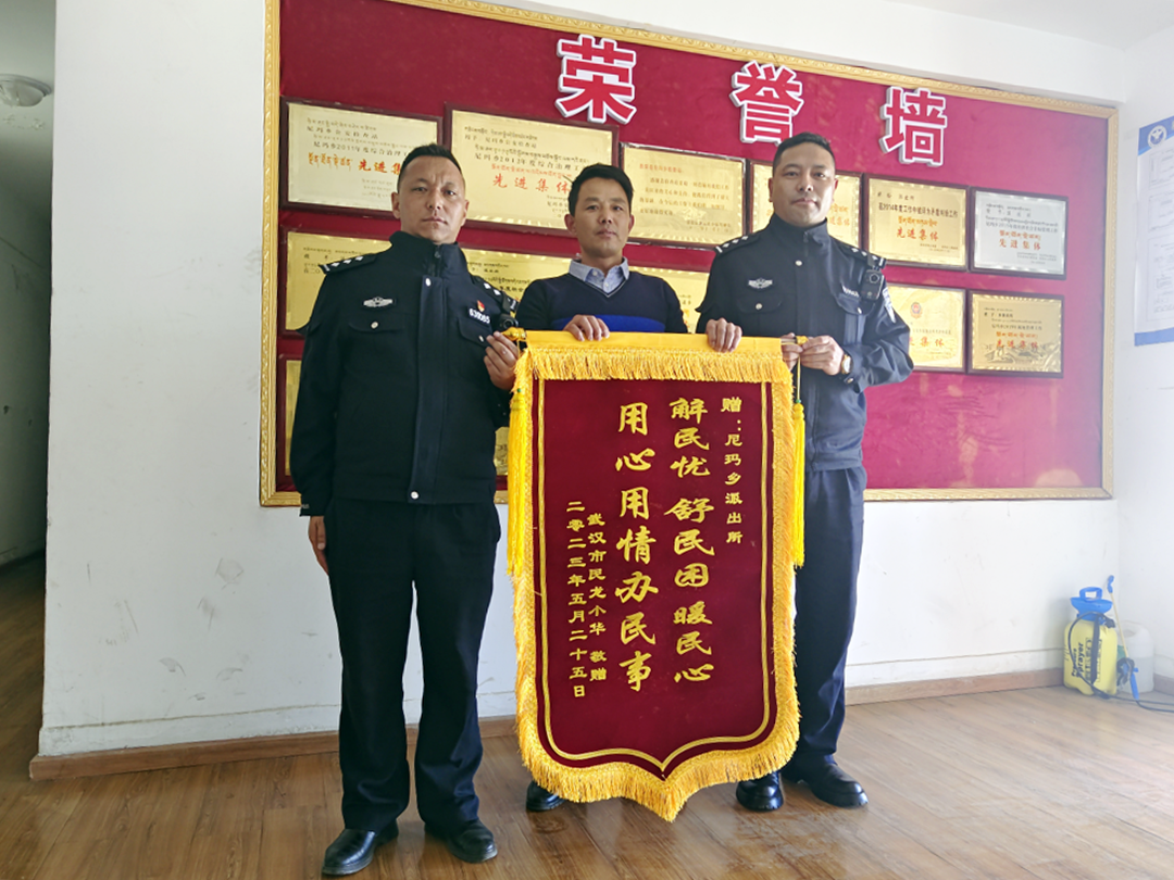 5月30日,尼玛乡派出所收到武汉龙先生送来的一面印有“用心用情办民事,解民忧舒民困暖民心”的锦旗。