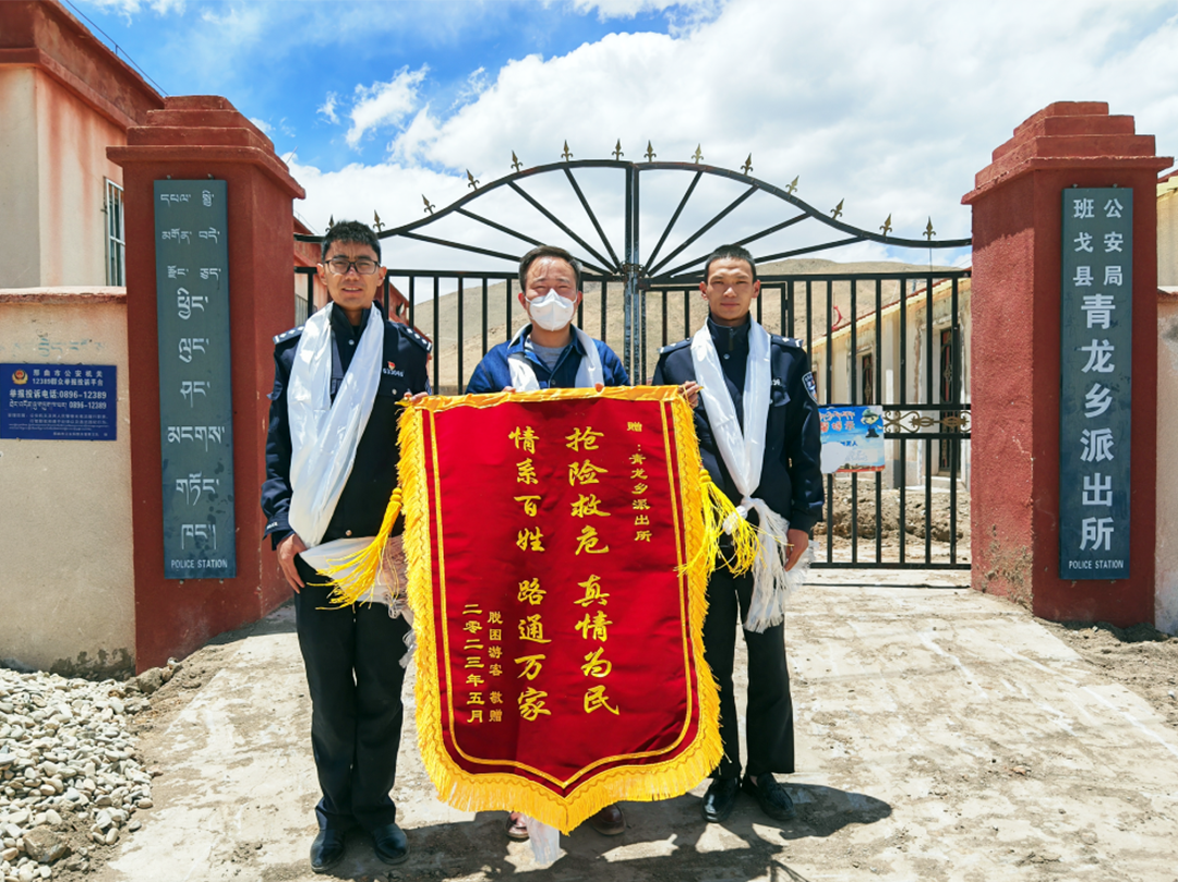 5月13日3时许,游客郑先生驾车途经青龙乡时,车辆不慎陷入雪坑被困,班戈县公安局青龙乡派出所民辅警立即携带救援装备前往现场实施救援,不畏严寒、凿冰刨雪,经过两个多小时的不懈努力,成功救出被困车辆及人员,确保了人民群众的生命财产安全。脱困游客郑先生激动地将一面印有“抢险救危、真情为民、情系百姓、路通万家”的锦旗交到民辅警手中。