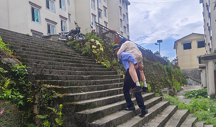 天气炎热,桑杰顿珠轻声安抚老人说:“别怕,我来背您回家。”随即背起老人沿台阶拾级而上,送老人上警车休息。最终经过1个多小时的走访询问,警务站成功找到老人亲属地址,安全将老人护送回家。