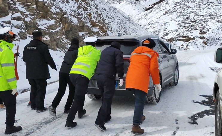 突如其来的大雪,把大地迅速染白,昂仁县辖区多处路段积雪,导致道路通行受阻,车辆出行安全风险加大,县交警大队第一时间启动恶劣天气应急预案,组织执勤民辅警全员上路,加强社会面巡逻防控和铲冰除雪工作,并在遇到受困车辆时立即开展救援,全力保障人民群众正常的生产生活秩序和出行安全。