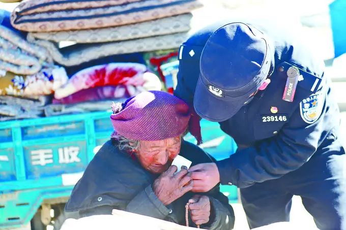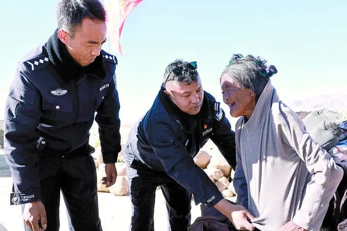 1月8日,白朗县公安局民警安抚孤寡老人紧张的情绪。旦增次仁摄