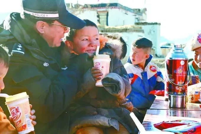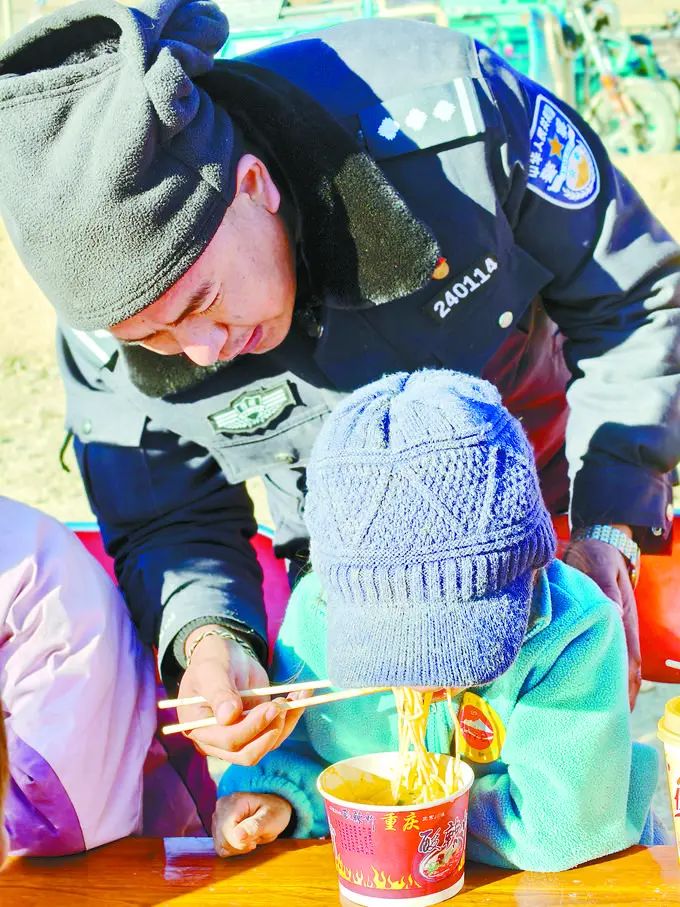 1月8日,仁布县公安局民警旦增顿珠将泡好的面喂给小朋友吃。赵瑞欣摄