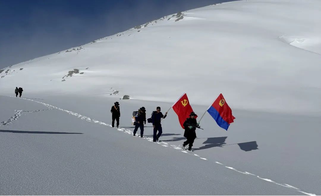 清晨7点,海拔5075米的西藏昌都市洛隆县噶扎拉雪山迎来第一缕阳光。虽是六月,但山上的气温却只有零下14度,此时,洛隆县公安局硕督镇派出所所长娜森已带着民辅警一行7人裹紧公安大衣,擎着党旗和警旗,带领群众踏着厚厚的积雪,翻山前往曲孜沟、色燃普虫草采挖点。