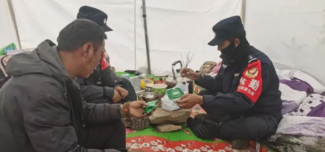 他们的帐篷就搭在群众帐篷旁边,这里俨然成为了一个流动警务站,群众有什么困难,第一时间就是往民警帐篷里去,小孩感冒生病了,找民警拿点感冒药,家里灯坏了,找民警帮忙修一修,给家中留守老人打视频不会操作,找民警帮忙......群众扎西说:“有他们在,我们就有依靠,看着帐篷上飘着的党旗和警旗,心里很踏实。”一系列大大小小事情,不仅让警民鱼水情得到了生动诠释,更是新时代"枫桥经验"在高原地区的创新实践,民警们用真心温暖民心,在雪域高原筑起了民族团结的“精神长城”。