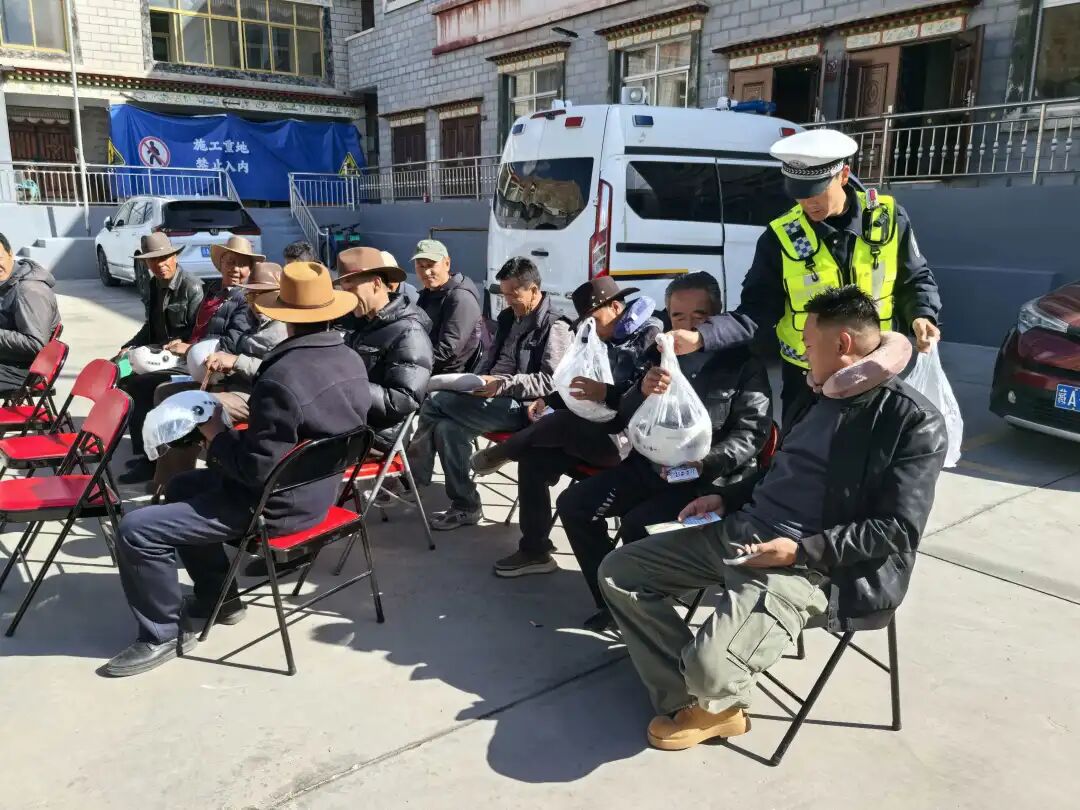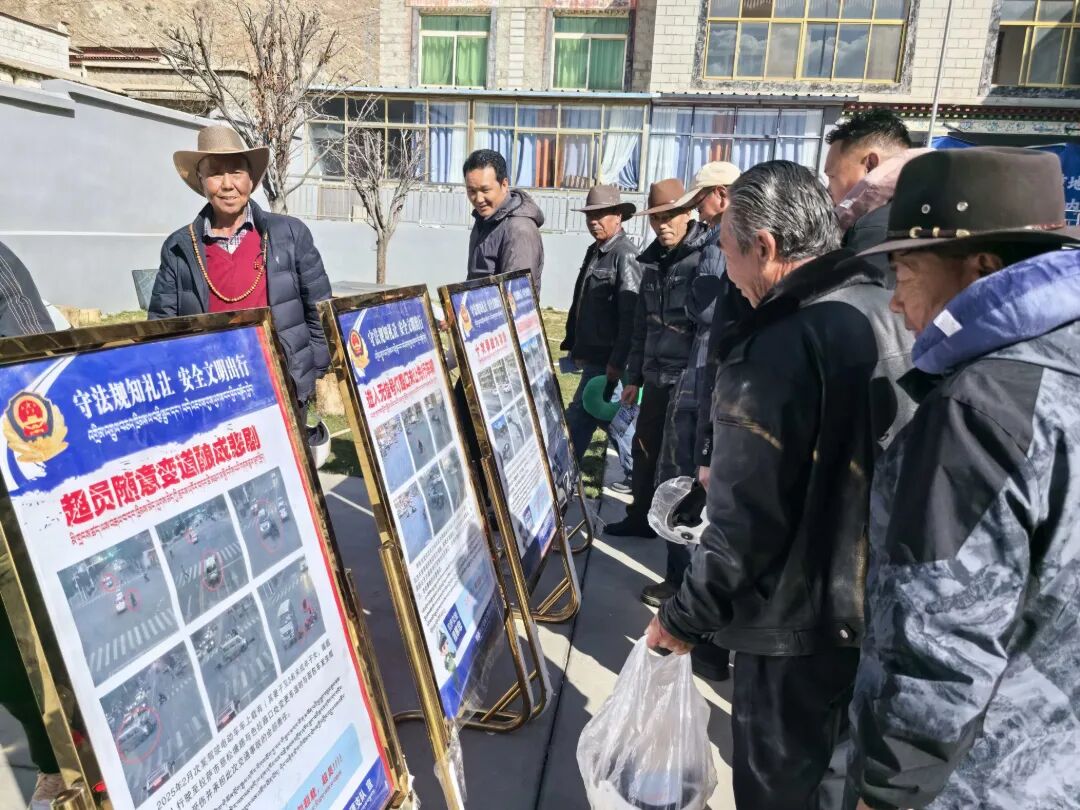 活动现场暖意融融、氛围热烈。宣传民警化身“交通安全宣传员”,在嘎巴村人员集中区域有序摆放交通安全宣传展板,展板上的典型事故案例、交通违法图解直观醒目,吸引了过往农牧民群众驻足观看、认真学习。