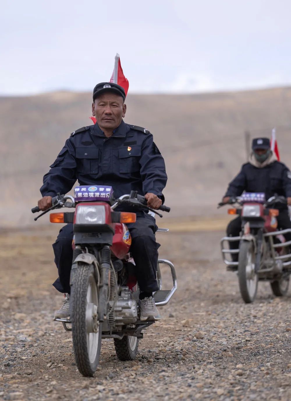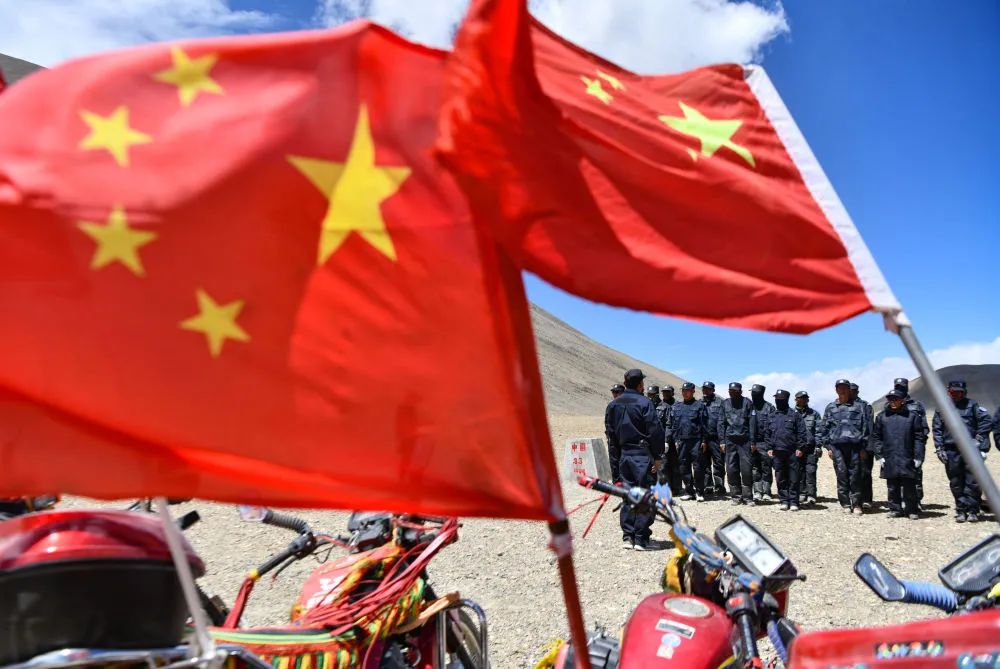 “2016年,我们开始在摩托车上携带国旗,”石角队长对记者说,“为什么在摩托车上插国旗呢?因为我们巡边要去边境第一线,要让国旗飘扬在国境线每个角落。”