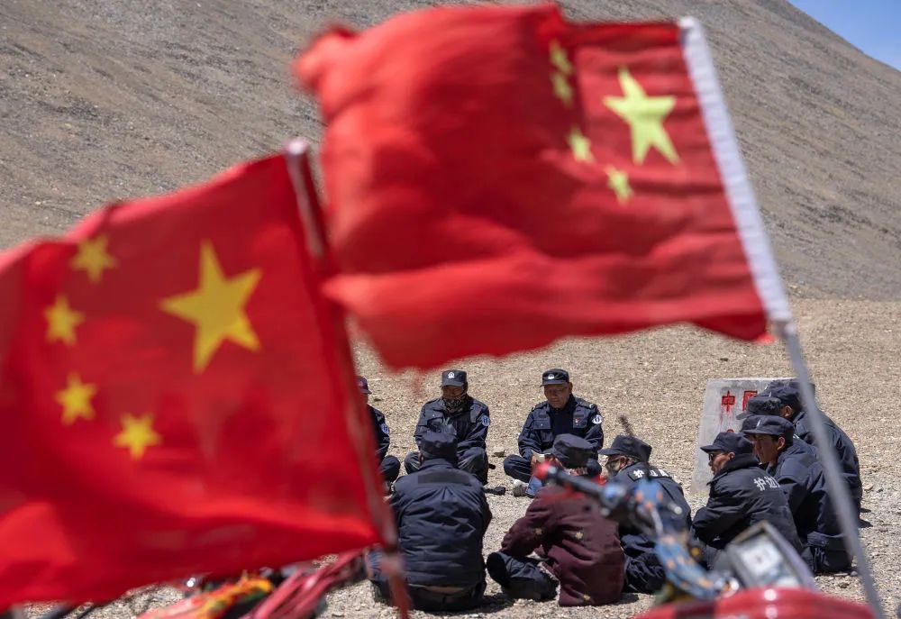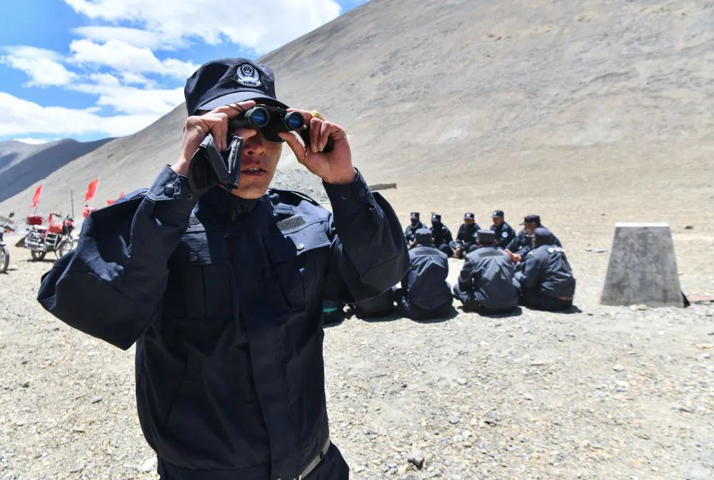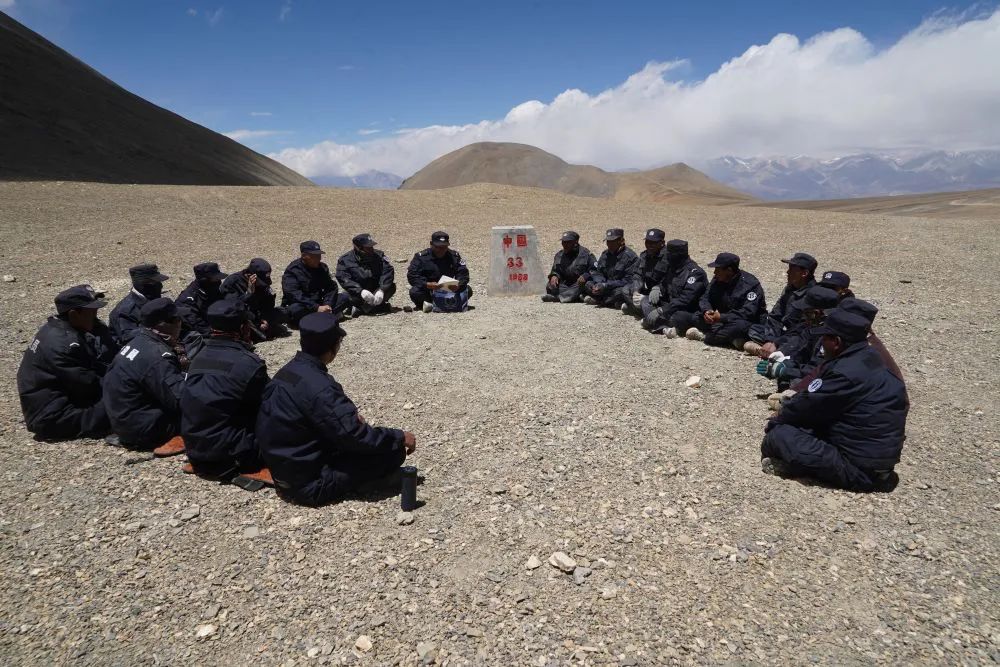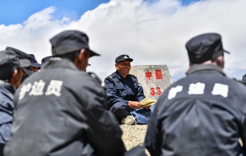 33号界桩所在的山口,风大得惊人,记者估计至少有9—10级,本来就是5000米左右的海拔,狂风一吹,感觉口鼻附近的氧气全给吹跑了,眼泪不停地流,不一会儿,操作相机的手也变得僵硬。石角和他的伙伴们却对此习以为常:今天的这种天气对他们来说,并不算最艰难的,如果是严冬,在这些平均海拔超过5000多米的边境线上巡逻,寒风刮来,会让人感觉是一把锋利的锯齿刀在脸上来回刮动。石角和护边队员们首先排好队向界桩敬礼,然后围坐在一起,由石角向大家交代最近的一些巡边护边的注意事项。随后,在石角的安排下,分成几组,沿着边境线开始了巡视。