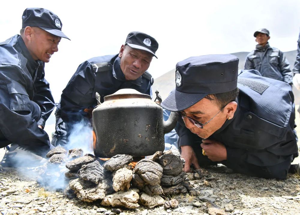 图为护边联防队队员在一块空地上点燃牛粪,准备午餐(6月2日摄)。