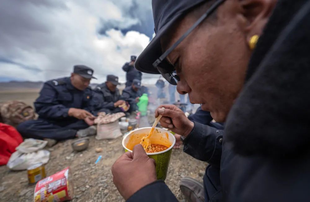 上午的巡逻结束后,摩托车队来到一片风力较小的草原,几个队员立刻拿出麻袋四处搜寻牛粪,其他的队员则开始准备水壶、酥油、茶饼、炒面……一场其乐融融的草原午餐就此展开。队员们个个都是草原生活的行家里手,不一会儿火焰就把水壶烧得嗞嗞冒气,糌粑捏起来,酥油茶冲起来,方便面泡起来……大家围坐在火堆旁,围坐在石角旁边,说着家长里短的事,议论着天南海北的新闻,有的队员还哼起了动听的歌曲——这就是一场亲朋好友的聚会啊!