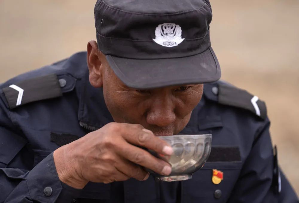 图为6月2日,午餐时间,石角在喝酥油茶。