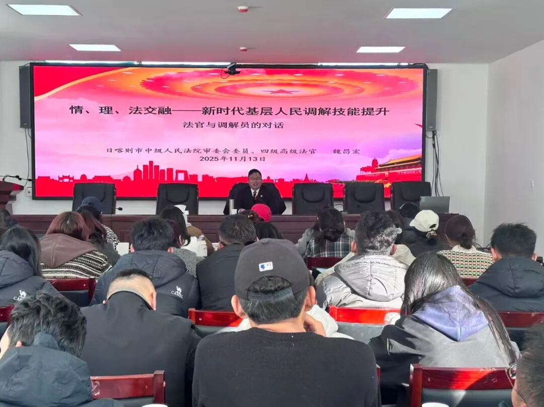 为深化矛盾纠纷多元化解工作,提升人民调解员专业素养和调解能力,落实人民法院指导人民调解法定职能,推动调解资源与司法力量深度协同,筑牢矛盾纠纷化解“第一道防线”,近日,日喀则市中级人民法院民事法官应邀在“2025年日喀则市第二期人民调解和安置帮教业务培训暨专职人民调解员能力素质提升行动培训班”上为全市基层人民调解员培训授课,全市18县区64名基层人民调解员参加培训。