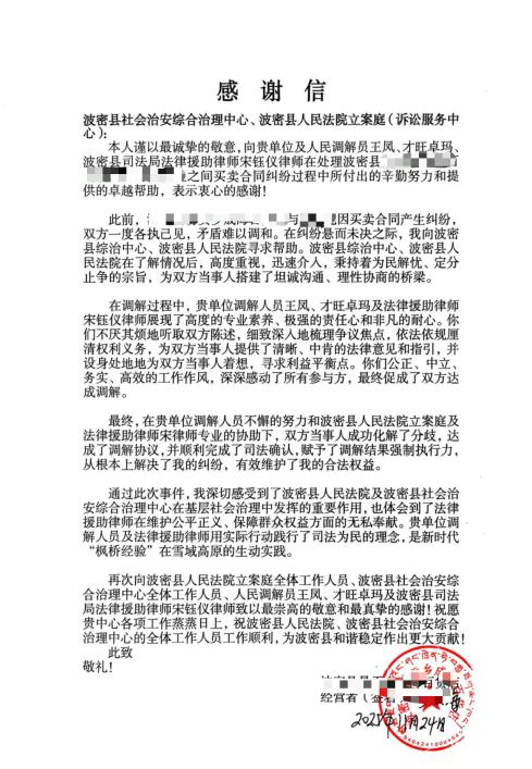 一纸薄笺,承载千言。近日,波密县社会治安综合治理中心与波密县人民法院收到了一封情真意切的感谢信。来信人是波密县某百货店的经营者沙某,信中诚挚感谢了波密县综治中心、波密县人民法院立案庭(诉讼服务中心),以及人民调解员和司法局法律援助律师,字里行间洋溢着对纠纷圆满化解的欣慰与对调解工作的高度赞誉,成为波密县深化基层治理、践行司法为民的温暖注脚。这封负载满满谢意的感谢信,正是这一机制优越性的体现,该纠纷在综治中心调解员和法院立案庭干警的协同努力下成功化解,达成的协议迅速通过法院司法确认,从“一纸约定”升级为“法律守护”。这不仅巩固了中心的调解权威,也让群众切实感受到“进一扇门,解所有忧”的便利与踏实,极大地增强了非诉讼纠纷化解方式的公信力和吸引力。综治中心因而成为了群众心目中信得过的“解纷便利店”和“和谐稳压器”。