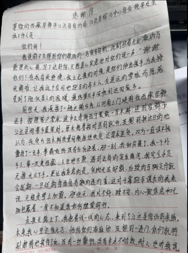 2026年3月,河南籍货车司机贾某承运货物至江达县同普乡,因买卖双方货物质量争议导致车辆滞留,司机首次入藏求助无门,且面临运输逾期风险,遂向江达县综治中心求助。