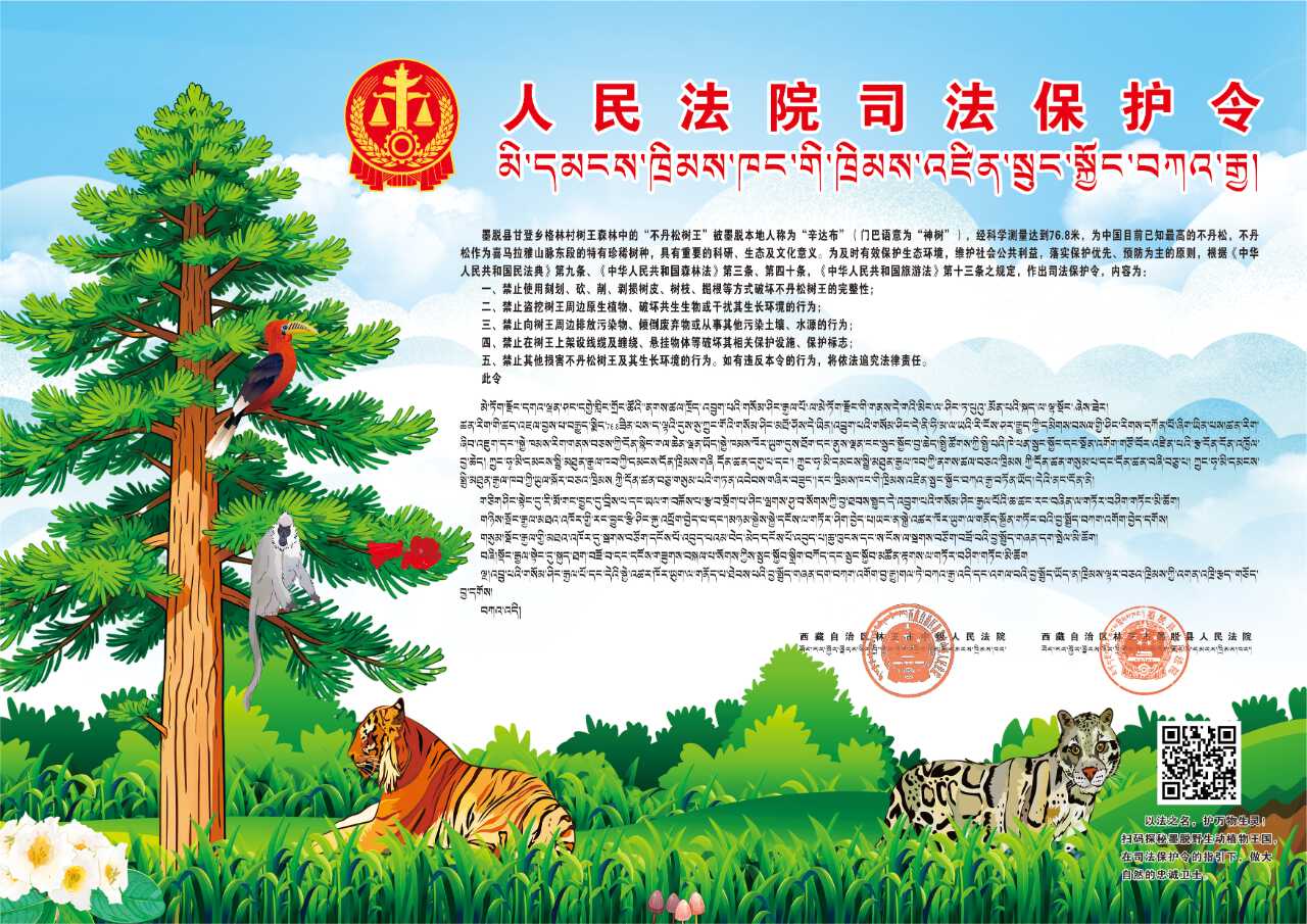 为践行习近平总书记绿水青山就是金山银山的理念,更好地保护墨脱珍稀植物资源,12月11日,林芝市中级人民法院、墨脱县人民法院联合发布不丹松“树王”《司法保护令》,并邀请墨脱县林业和草原局共同开展竖牌活动。此次出台的《司法保护令》是在野生独蒜兰《司法保护令》的基础上再发力,也是立足本地生态资源禀赋、探索特色生态司法路径的又一关键举措。