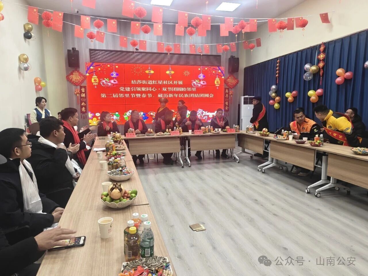 在春节、藏历年来临之际,为深化山南市公安局与社区共驻共建、资源共享的联动机制,密切警民关系,丰富党员民辅警精神文化生活,营造喜庆祥和、团结奋进的节日氛围。2月10日上午,市公安局机关党委组织各党支部开展“双报到”活动。同时组织党员民辅警代表参加结莎街道红星社区组织的“第二届喜迎春节、藏历新年邻里节”一系列形式多样、内涵丰富的主题活动。