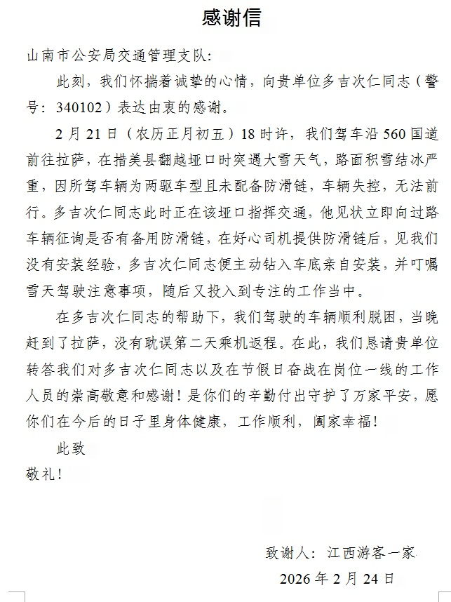 为表达这份跨越千里的感激,游客一家特意写下感谢信,寄至山南市公安局交通管理支队,恳请支队转达对多吉次仁的崇高敬意,以及对所有节假日坚守岗位民警的衷心感谢。在后续的沟通中,游客还发来消息感慨:“西藏公职人员的敬业、热情给我们留下了极深的印象,谢谢你们!”
