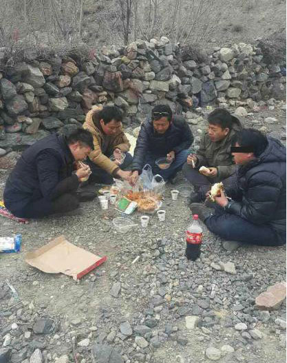 1月28日,大年初一这一天,拉萨市公安局刑警支队的民警连夜赶到现场将犯罪嫌疑人根某押解回拉萨。这张照片就记录下了重案大队的民警和犯罪嫌疑人根某在途中一起用餐的画面。