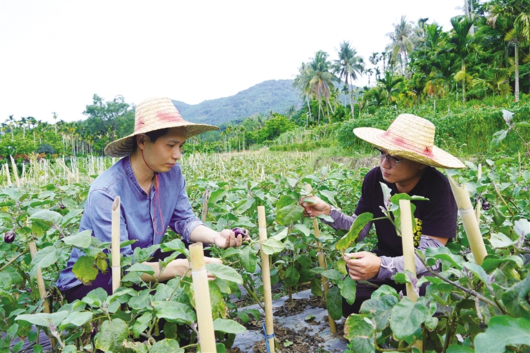 葛冠鹏(左)和乡村振兴工作队队员在地里查看茄子长势。记者潘德刚 摄