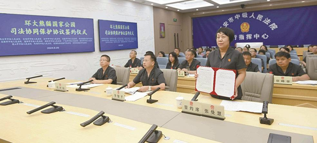 2024年8月29日,在西安市中级人民法院执行指挥中心,陕西、四川、甘肃3地的14家中级人民法院以视频连线形式,共同签署《环大熊猫国家公园司法协同保护协议》(资料照片)。通讯员徐军摄