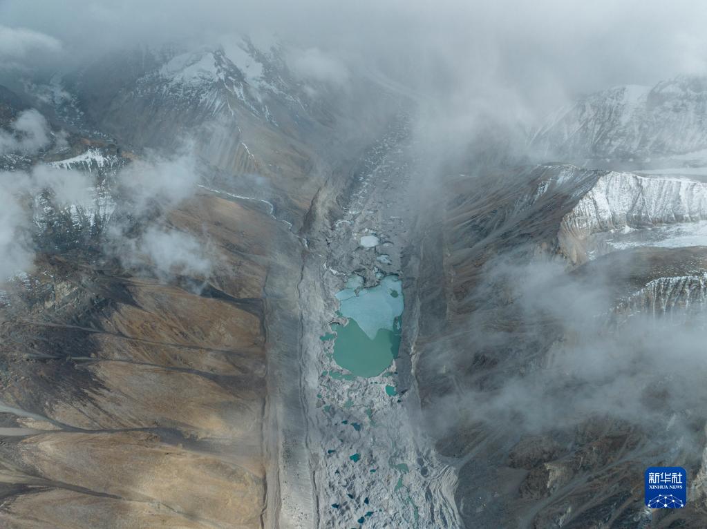 这是在海拔7000米左右高空拍摄的由绒布冰川融水形成的湖泊群(5月25日摄,无人机照片)。新华社发(旦增努布 摄)