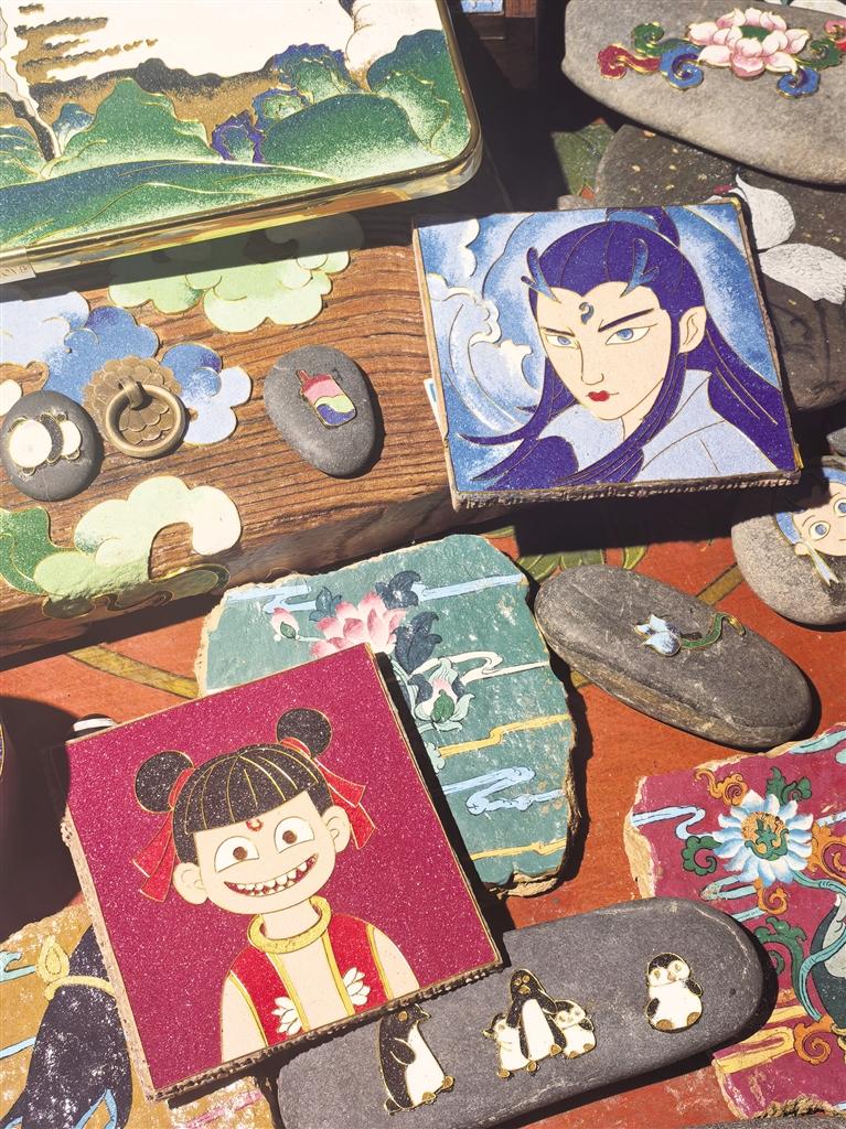 只见占地不到20平方米的小屋内,摆放着各类唐卡画作。既有传统唐卡作品,亦有动画人物的“绘像”。描边的金属丝和光滑的质感表面让人忍不住驻足欣赏。店里陈列着巴掌大小的掐丝唐卡,金线掐丝在矿物颜料映衬下流光溢彩。画师兼老板的南吉合多杰正在完成一份冈仁波齐的客单:“勉萨画派的特色是线条细腻,颜色过渡自然。选好图案后,会根据载体材质、大小(例如石头大小、木板长短等)收费。”他一边说着,一边用特制工具将颜料注入金丝隔断。