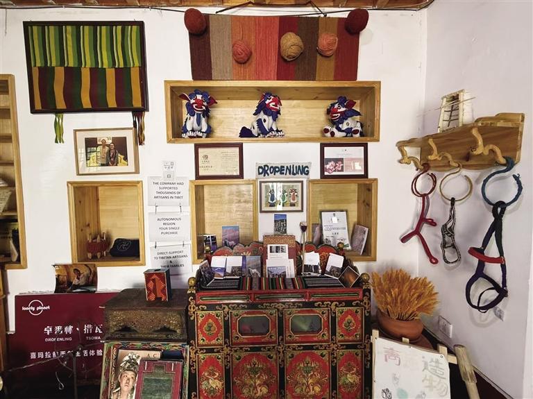 进入卓番林,只见狭长的店面内琳琅满目地摆着各类富有藏元素的物件,里侧的木质货架上整齐挂着多条不同颜色和格纹样式的织物,货架上方摆放着展示手工编织过程的照片。工作人员告诉记者,这些都是可售卖的,除此之外,游客来到这里,还可以体验酥油香皂、酥油唇膏、藏式刺绣等手工DIY。