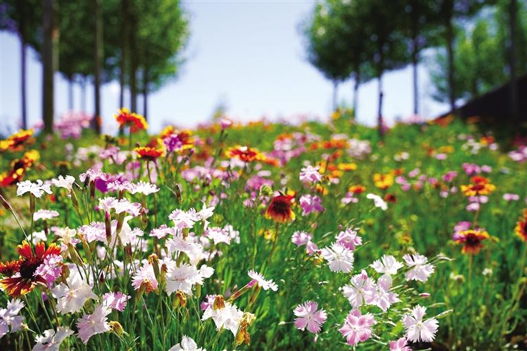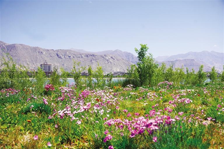 六月的拉萨,阳光正好。澄澈蓝天如洗,高远而明亮。柳梧大桥下的滨河公园,河畔草地铺满各色小花,红的明艳、粉的柔和、紫的淡雅,肆意绽放在绿意间,仿佛步入印象派大师莫奈的画布之中。成片盛开的各类花卉争奇斗艳,五彩斑斓的花朵沿着河畔铺展开来,形成一片片绚丽的花海。不同颜色的花朵相互交织,随风摇曳,与蓝天白云、碧绿的河水、远处绿意盎然的南山相映成趣,构成了一幅花海画卷。
