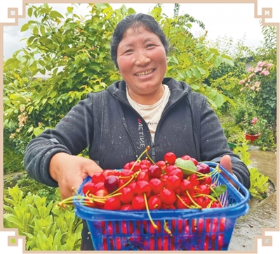 村民在展示从自家庭院中采收的樱桃。黄海芬摄