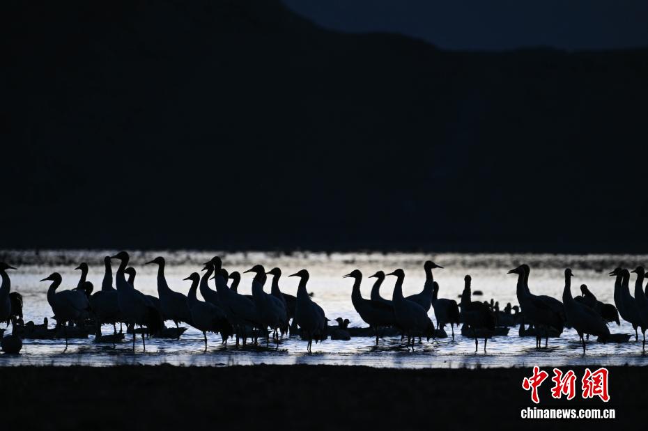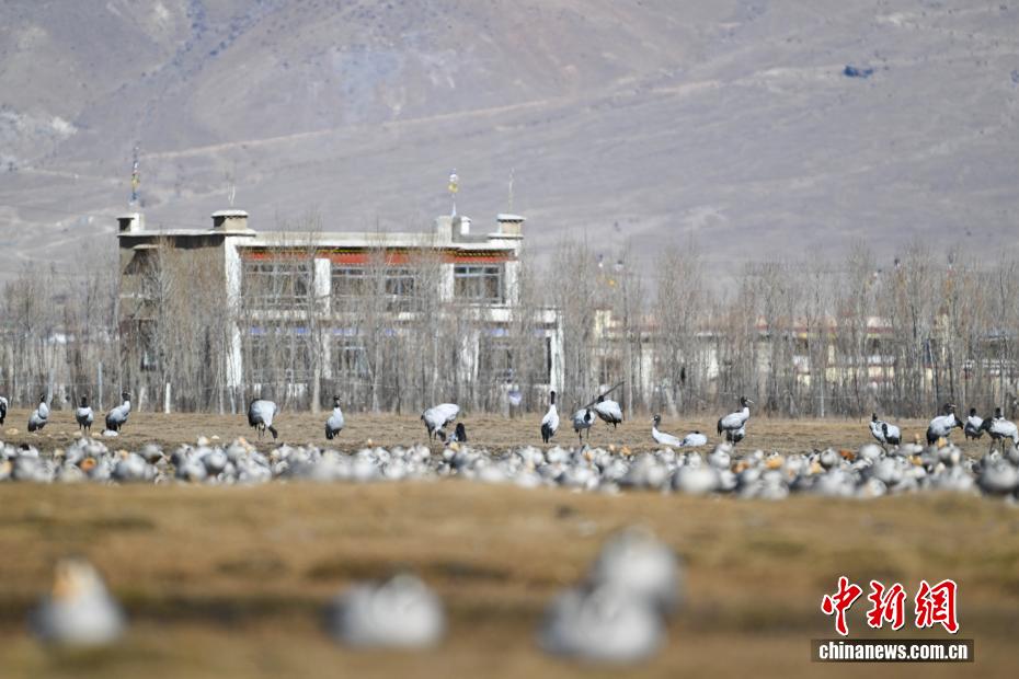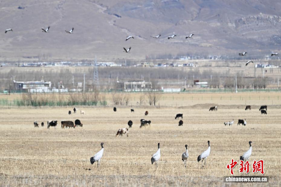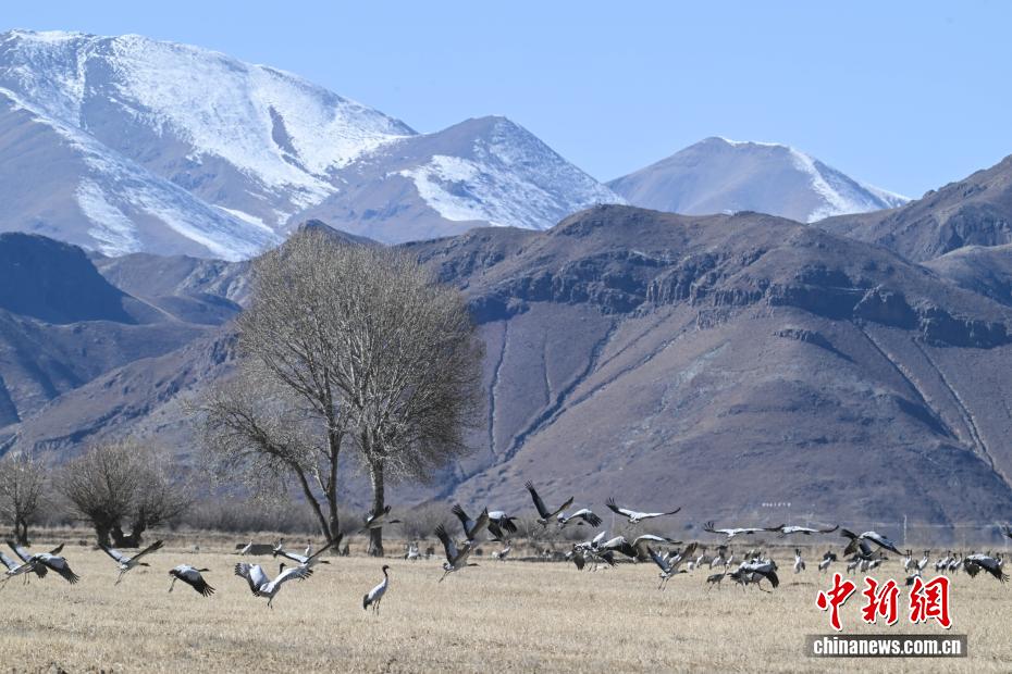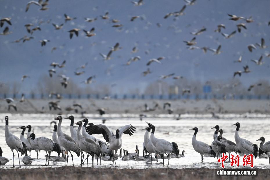 11月26日,位于西藏自治区拉萨市林周县的黑颈鹤自然保护区内,大量越冬的黑颈鹤在卡孜水库、农田、湿地里觅食、嬉戏。林周县位于拉萨河上游及澎波河流域,是黑颈鹤的主要越冬地之一。中新社记者 贡嘎来松 摄