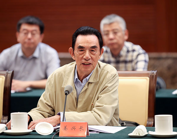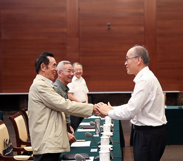 会前,张军与咨询委员会离任委员代表握手寒暄。