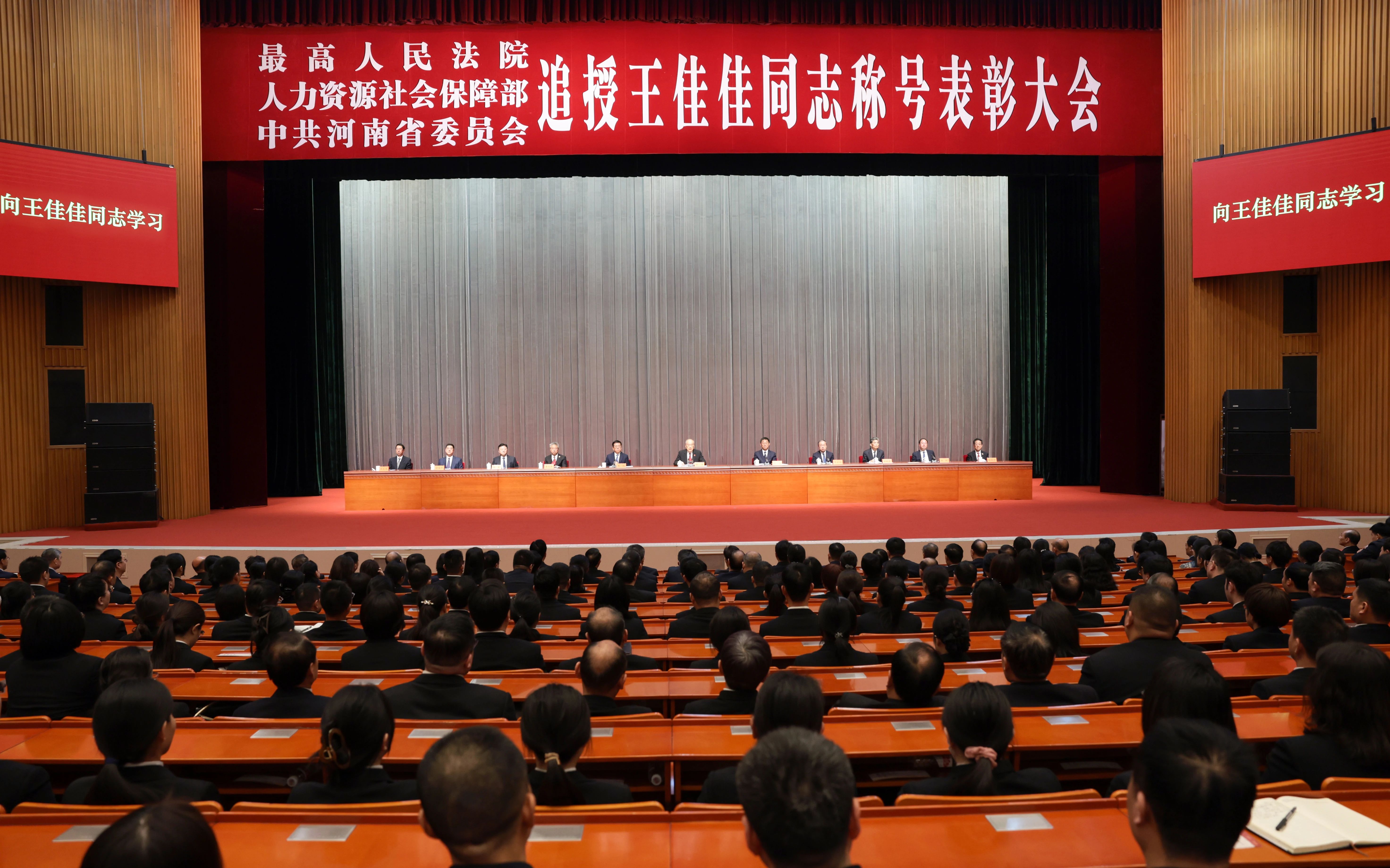 2月28日,最高人民法院、人力资源和社会保障部、河南省委在河南省郑州市联合召开追授王佳佳同志称号表彰大会。
