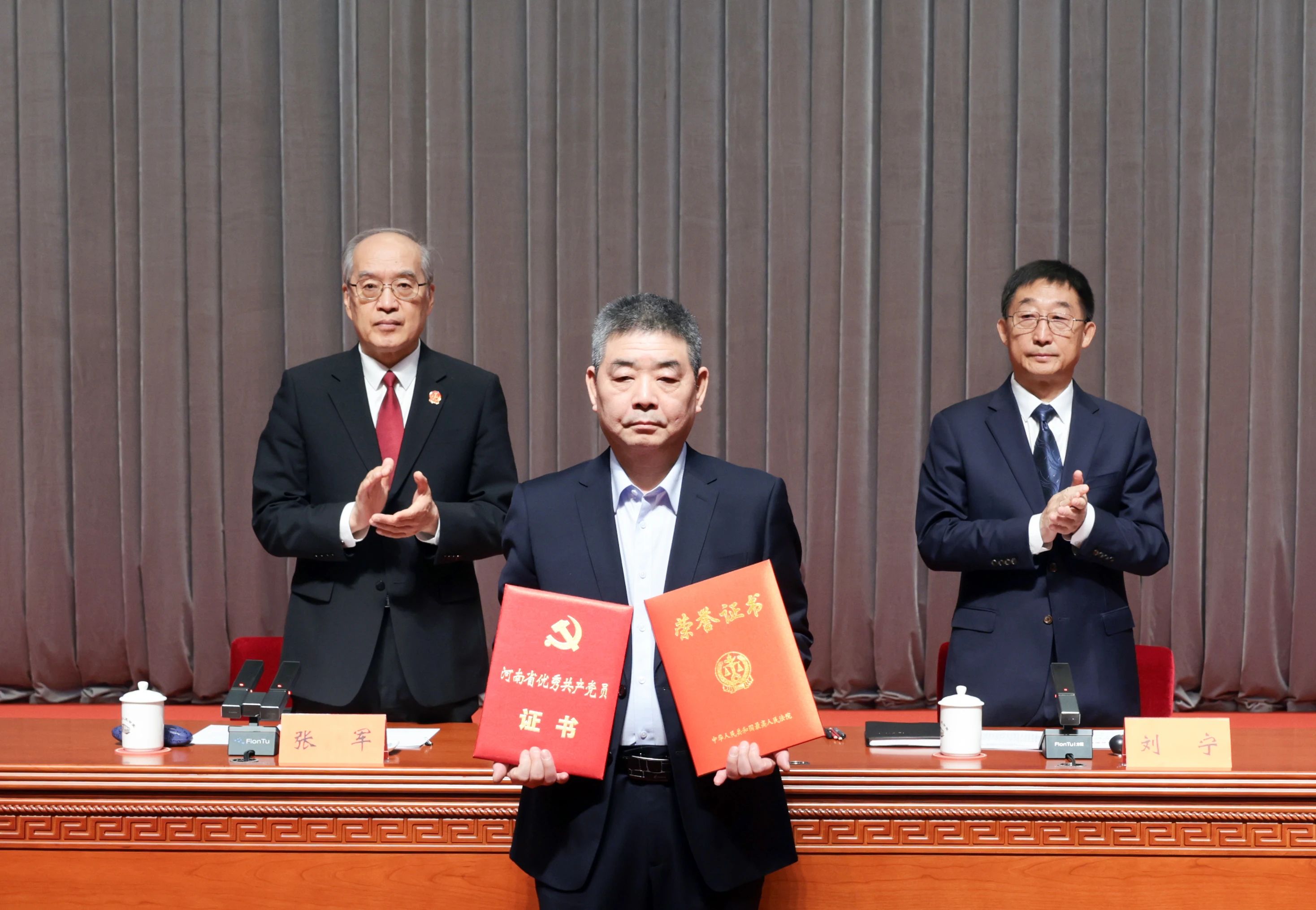 张军、刘宁分别向王佳佳同志家属颁发“全国模范法官”证书和“河南省优秀共产党员”证书。