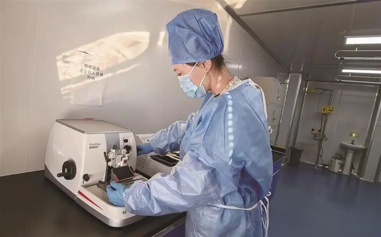 司法鉴定人员正在进行法医病理切片操作。