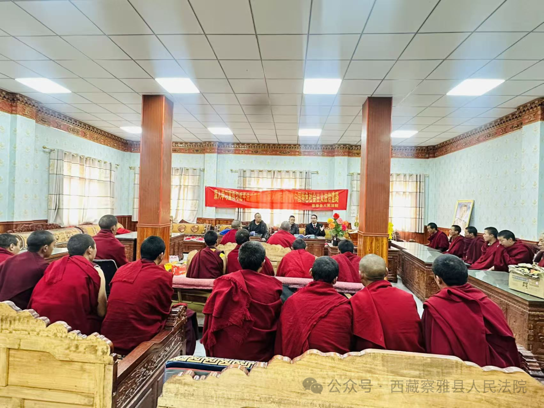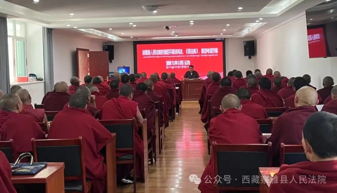 察雅县人民法院始终将维护国家安全、促进宗教和谐作为普法重点。在全民国家安全教育日,联合多部门开展宣传活动,通过悬挂横幅、以案释法等形式,教育群众防范网络风险,筑牢国家安全人民防线。同时,开展“送法进寺庙”活动,向僧尼和信教群众宣讲《中华人民共和国宪法》《中华人民共和国民法典》《宗教事务条例》等法律法规,引导爱国爱教、遵规守法,让法治理念融入宗教活动各环节,为民族团结与社会稳定提供法治保障。