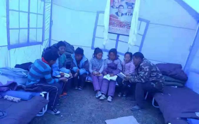 安置点内不忘认真学习的小朋友们