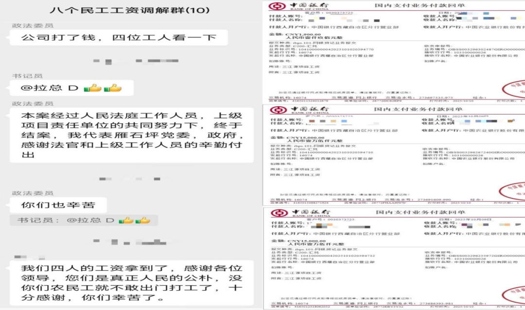 调解协议达成后,法庭与综治中心坚持“调解不止步、履责不松劲”,并未“一调了之”。工作人员建立微信联络群,跟踪项目方履行进度。期间,针对项目方一度出现的“拖延支付”苗头,调解团队多次上门与负责人沟通,反复强调失信行为对企业信用的影响,以及可能面临的强制执行后果。经过近一个月的持续督促,项目方最终将10余万元涉案工资足额发放到8名务工群众手中。拿到工资后,一名务工群众激动地在微信群回复:“您们是真正的人民公仆,没有你们,我们农民工出门打工都不踏实,太感谢您们了!”