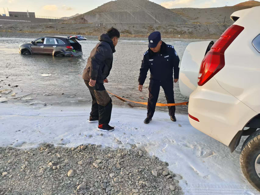 1月19日,噶尔县公安局北京路便民警务站接情指中心指令:一辆私家车不慎陷入冰河,驾驶员无法脱困,请求救援。