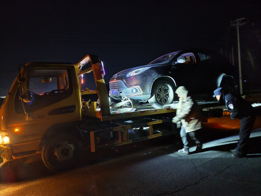 警情就是命令!接警后,值班民辅警迅速带上救援装备赶往现场,到达现场后发现车辆被困在冰河中。民辅警立即开展救援,因被困车辆离岸边较远、车辆无法启动,民辅警尝试多次拖拽无果后,迅速联系专业救援队伍。专业救援队抵达后,民警与救援人员合力制定“远程牵引”方案,通过固定救援缆绳、岸边锚定发力,稳步将被困车辆拖拽至安全区域。全程高效协同,成功化解险情。